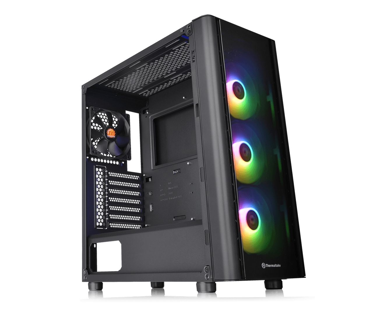 V250 Temperli Cam ARGB Orta Kule Kasa, Thermaltake V Serisi kasanın en yeni üyesidir. Kasa ile birlikte gelen üç adet 120mm 5V ARGB ön fanı, anakart senkronizasyon yazılımı veya G / Ç bağlantı noktasının üstündeki RGB anahtarı ile kontrol edilebilir. Diğer olağanüstü özellikler arasında hem oyuncular hem de meraklılar için ideal olan genel olağanüstü performans için 4 mm temperli cam panel ve tam boy PSU kapağı bulunur.
